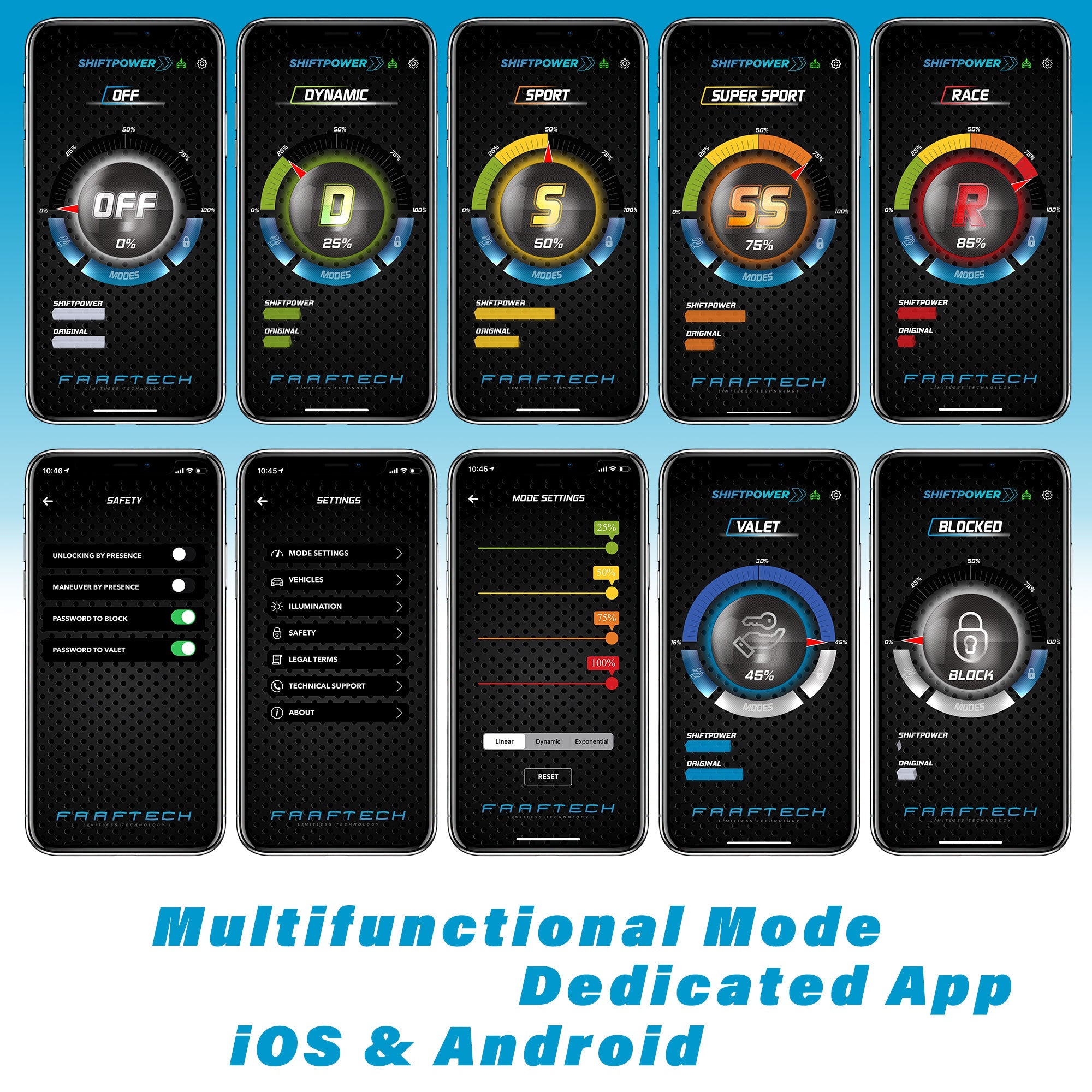 Eliminating the acceleration delay with various driving modes: Race, Super Sport, Sport, Dynamic, Eco, Valet, Lock with three different acceleration curves: Linear, Dynamic and Exponential.